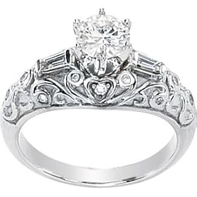 Gorgeous! 14k White-gold 1CT Round Moissanite and Diamond Engagement Ring. In The center is one 6.00 MM=1CT Very Good Round Moissanite jewel. Each side has One Straight 3.5x2.00x1.50 and are I1- S12-S-13 GH in color Quality Baguett Diamond. Each side of the shank is beautifully Hand engraved. What a Beautiful item Item!!! Fifty Thousand yeas ago, a meteorite containing a unique secret landed in the Arizona desert. That secret was Moissanite. The essence of the stars is captured in these Moissanite stones. Moissanite has a fire, brilliance, and luster unlike other jewels. Moissanite is harder that any other jewel except diamond. Every Charles & Colvard Created Moissanite will come with a Lifetime warranty that they will maintain their brilliance and fire for the lifetime of the owner.