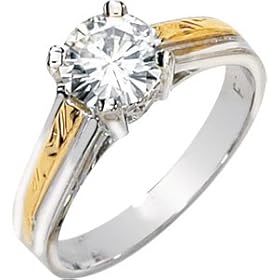 Reach For the Stars! Glamorous! Hand Engraved. Polished Two-Tone 14k Yellow/White-Gold 1CT 6.50MM Round Very Good Faceted Moissanite Stone. Fifty Thousand years ago, a meteorite containing a unique secret landed in the Arizona desert. That secret was Moissanite. The essence of the stars is captured in these Moissanite stones. Moissanite has a fire, brilliance, and luster unlike other jewels. Moissanite is harder that any other jewel except diamond. Every Charles & Colvard Created Moissanite will come with a limited Lifetime warranty that they will maintain their brilliance and fire for the lifetime of the owner.