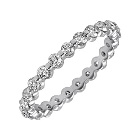 A full circle of diamonds is a beautiful symbol of your everlasting love. Embrace the sentiment with this stunning diamond eternity band, available in your choice of radiant 14 karat white or yellow gold. Sparkling round diamonds encircle the finger in shared prong settings, creating eye-catching brilliance from any angle. There are between 20 and 23 diamonds in this ring, depending on the size of the band. The diamonds have a minimum I color and SI2 clarity and a total combined weight of one carat.